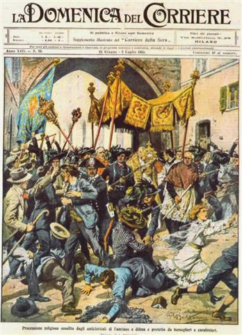 Ad Ancona, domenica 7 giugno 1914 si svolgono, come in molte altre città d’Italia, le celebrazioni governative per lo statuto; contemporaneamente i sovversivi organizzano manifestazioni antimilitariste. Nell’incontro del pomeriggio intervengono circa seicento persone: parlano Pietro Nenni per i repubblicani, Errico Malatesta per gli anarchici, Ercoli per i socialisti, Pelizza per la camera del lavoro e Livio Ciardi per i ferrovieri. Alle ore 18.35 tutto è finito: sembra che la manifestazione debba sciogliersi senza complicazioni di ordine pubblico. Invece, all’uscita di Villa Rossa si forma spontaneamente un assembramento di circa duecento persone, le quali, al canto dell’inno dei lavoratori, cominciano a scendere per via Torrioni con l’intento di giungere in piazza Roma, dove in quel momento la banda del Buon Pastore sta iniziando il concerto con la marcia reale.